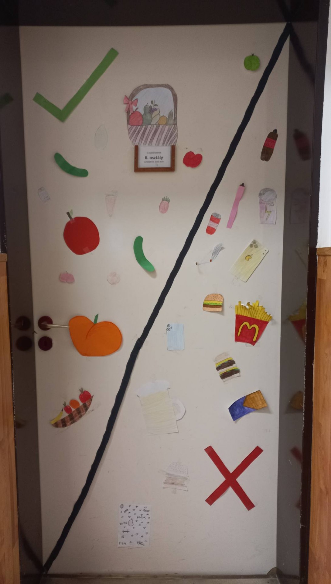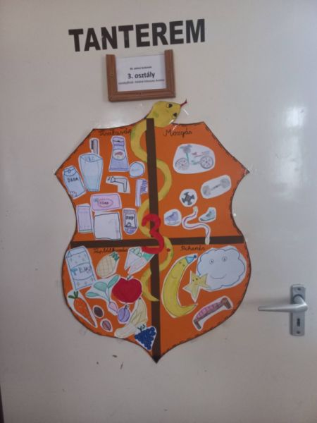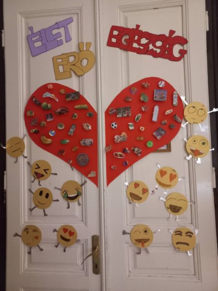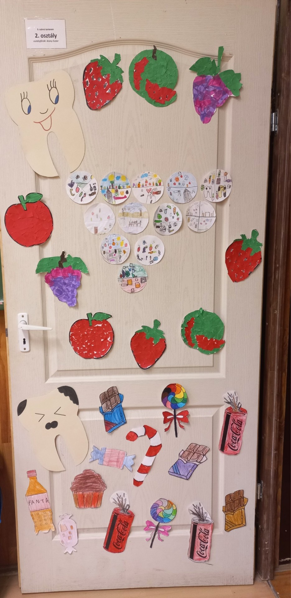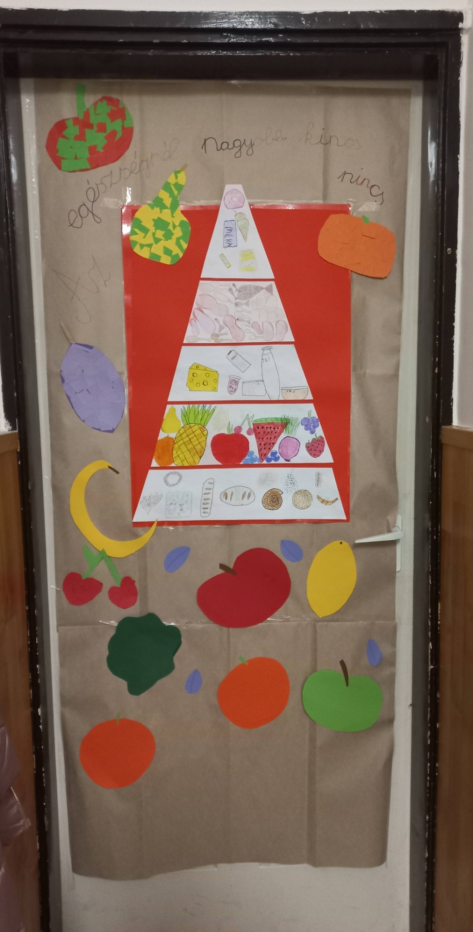 A teremajtókra is szebbnél szebb dekorációk kerültek. A felsősök közül a hetedikeseké, az alsóból a második osztályé sikerült a legjobban a zsűri szerint. (A képek sorát az elsősök ajtaja nyitja, és a nyolcadikasoké zárja.)
