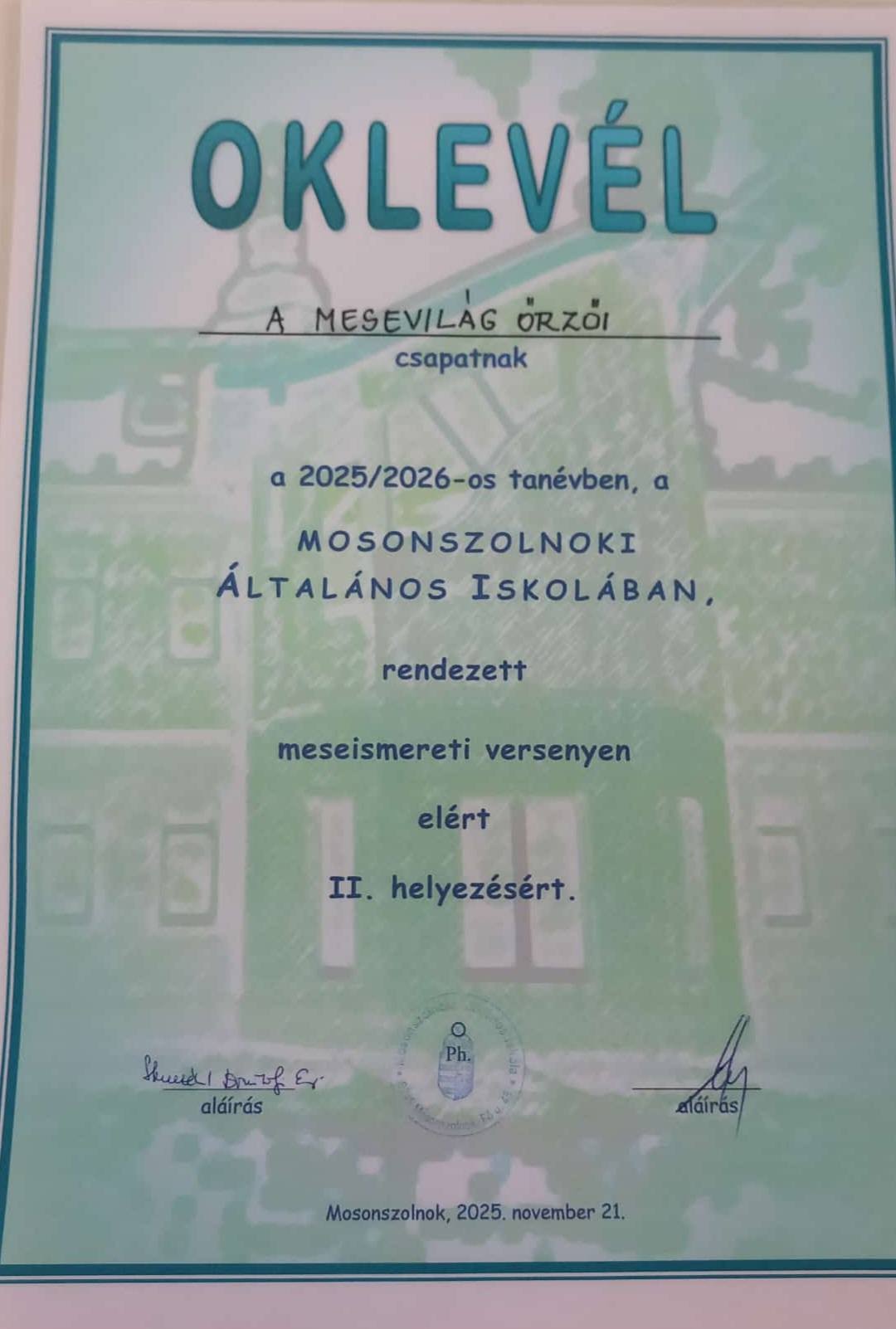 Negyedik osztályos tanulóink pénteken 4 fős csapattal indultak a Mosonszolnoki Általános Iskola által szervezett meseismereti versenyen, ahol 2. helyezést értek el.