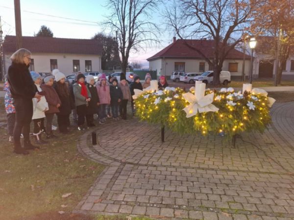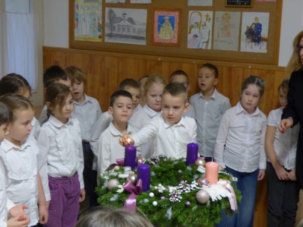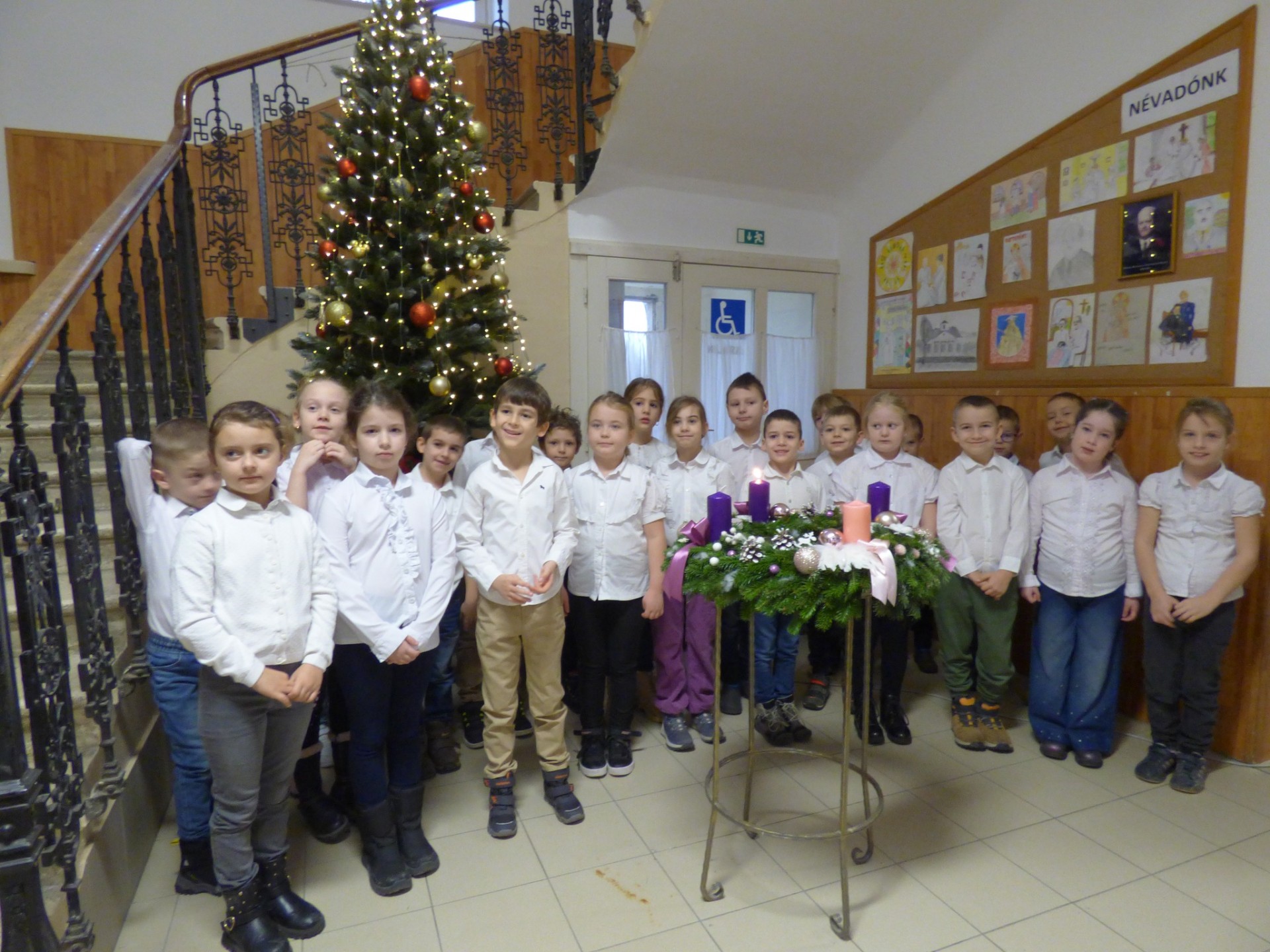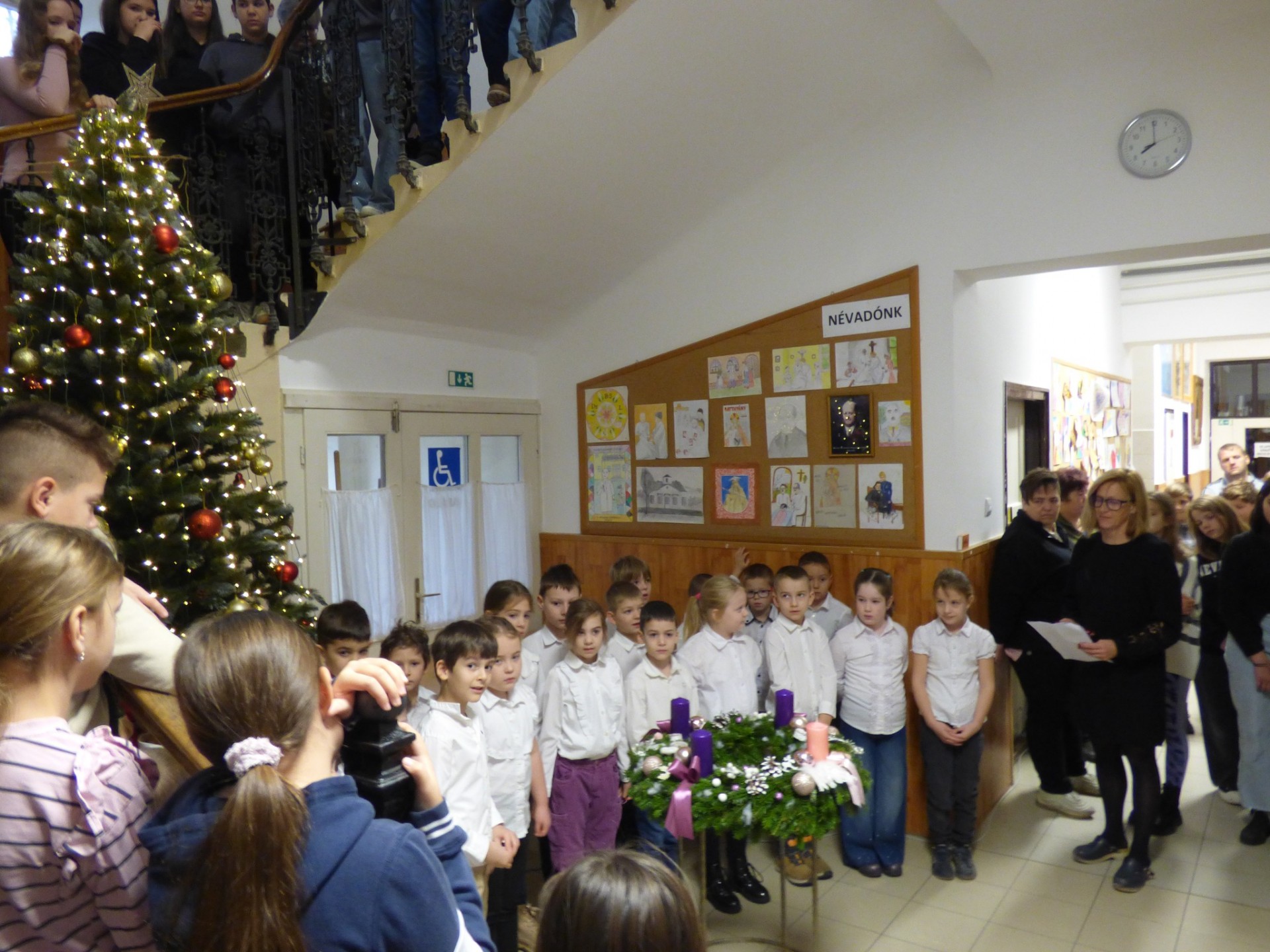 Meggyulladt az első gyerta az adventi koszorún iskolánkban is. Az első osztályosok bájos műsorát Sléber Judit segítette.